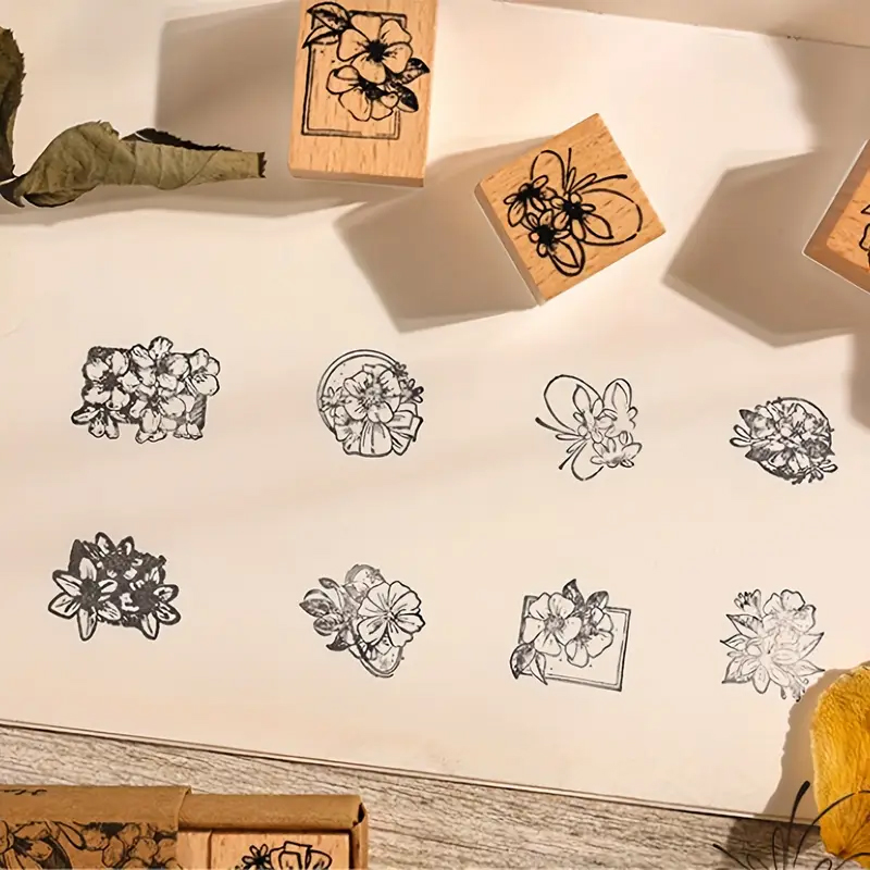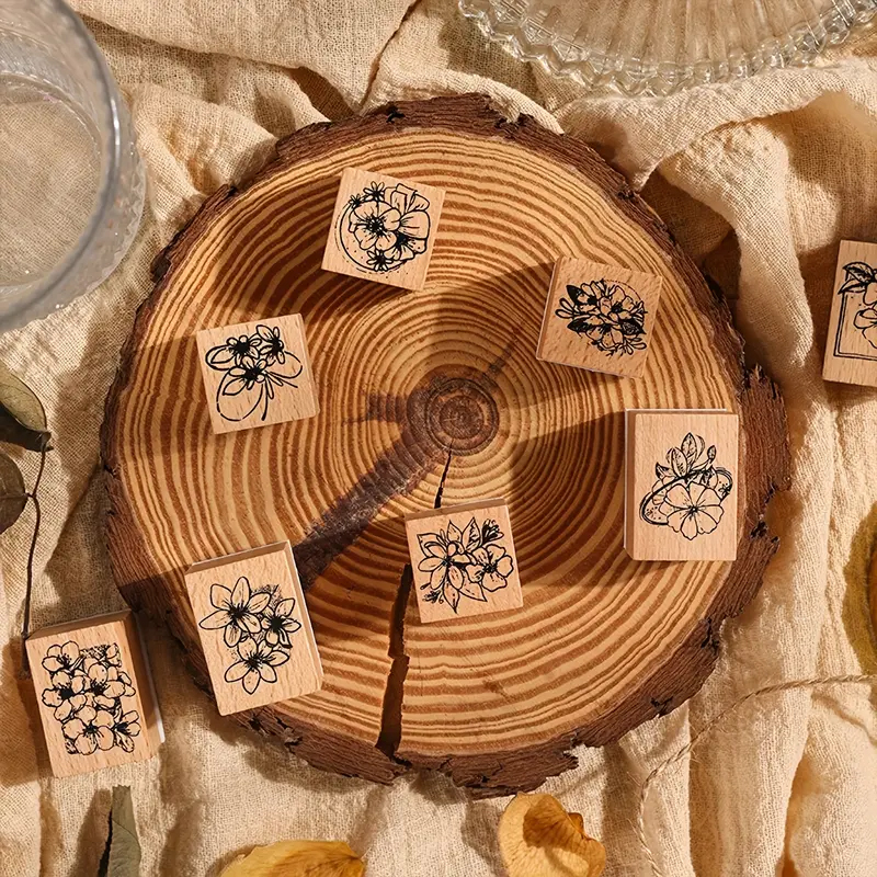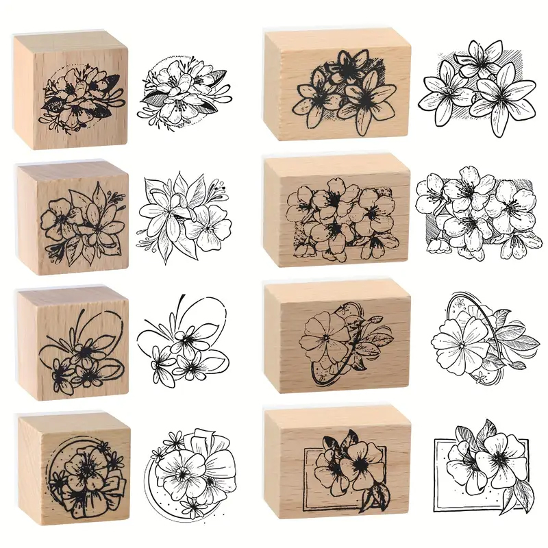 Blüten Holzstempel Set – 8-teilig mit floralen Gummistempeln