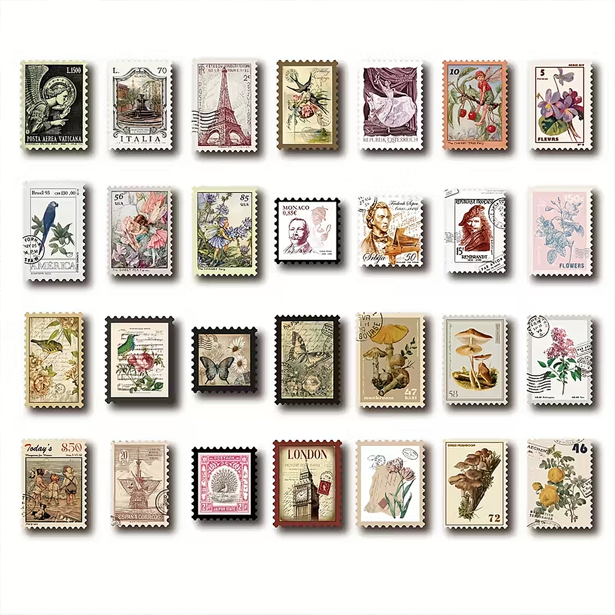 Die botanische Briefmarken Sticker präsentieren eine detailreiche Auswahl von 50 verschiedenen Stickern, die im charakteristischen Briefmarken Look gestaltet sind. Mit dem Schwerpunkt auf botanische Pflanzen und Blumen bieten diese Sticker vielseitige Möglichkeiten zur individuellen Gestaltung von kreativen Projekten.