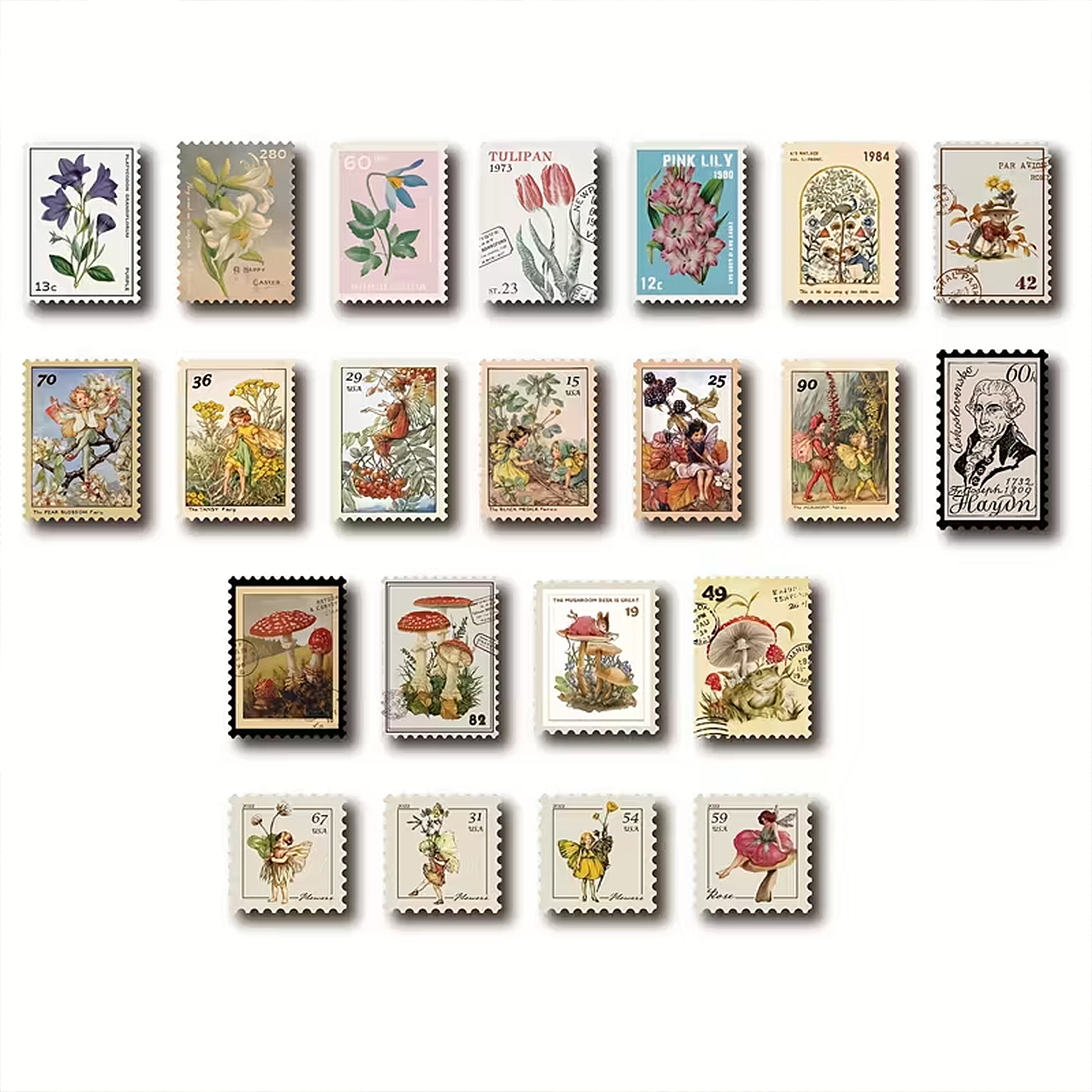 Botanische Briefmarken Sticker – 50 Motive floraler Pflanzen im Vintage-Look