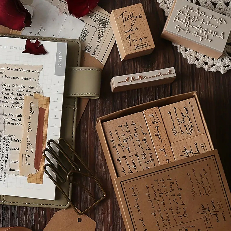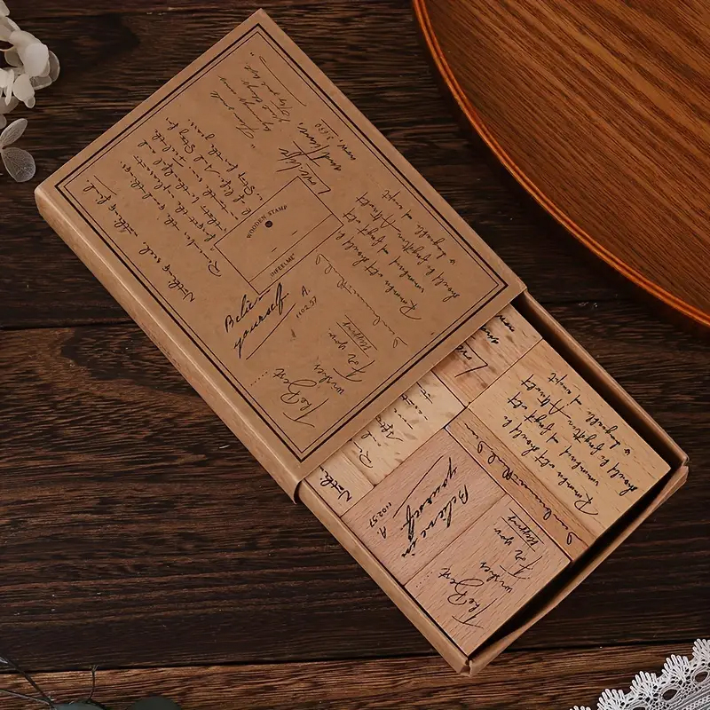 Das Retro Holzstempel Set inspirierende Sprüche vereint klassische Gestaltung mit zeitgemäßer Kreativität. Enthalten sind insgesamt acht unterschiedliche Stempel, deren Sprüche in eleganter Schreibschrift gestaltet sind. Das Set bietet vielseitige Möglichkeiten zur individuellen Gestaltung, insbesondere für Scrapbooking Ideen oder das kreative Dekorieren von DIY Grußkarten.