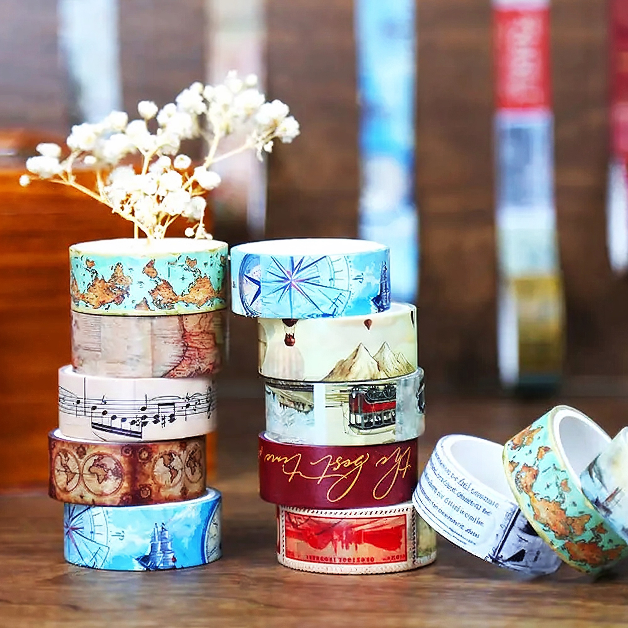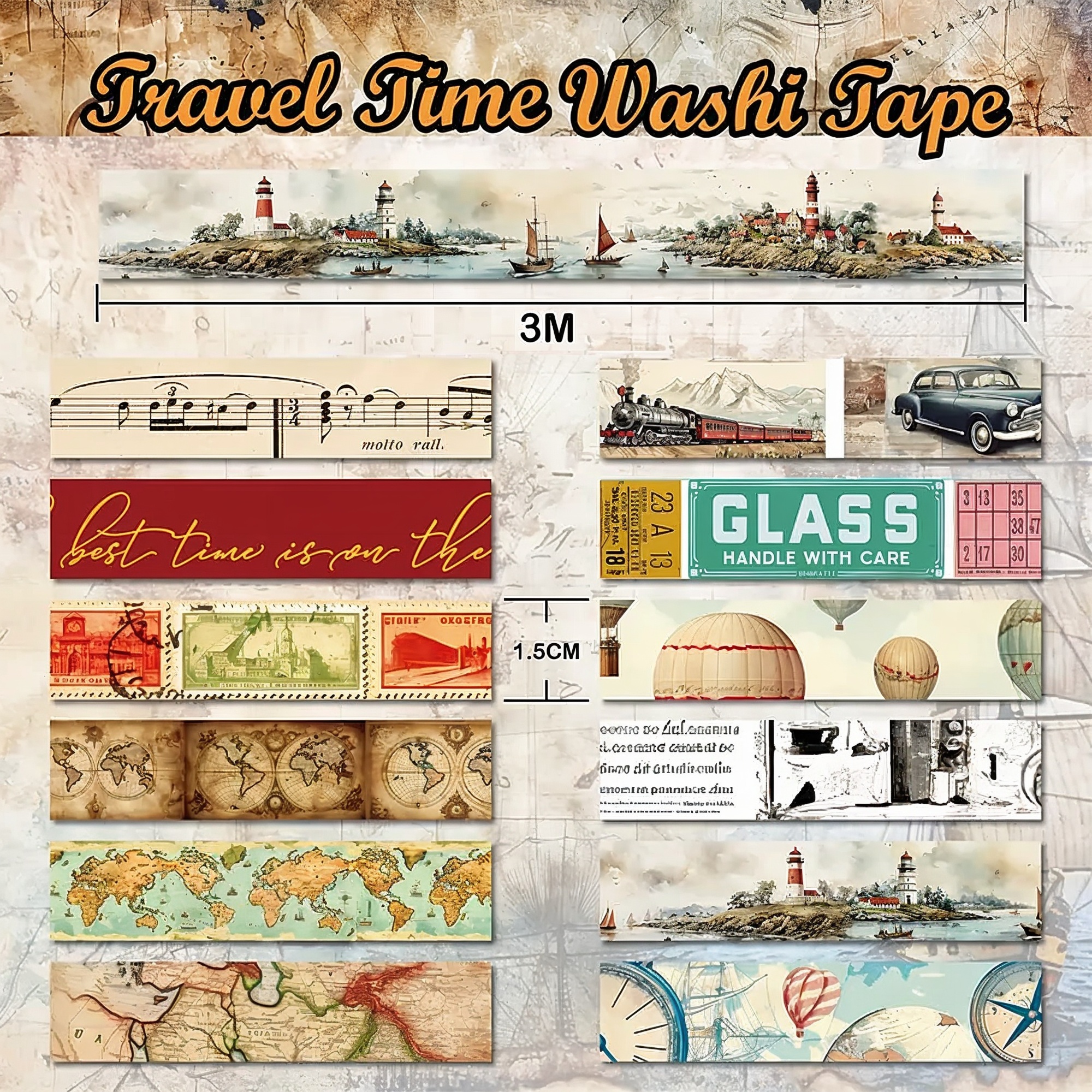 Das Retro Washi Tape Set bietet 12 Rollen einzigartiges Papier Klebeband mit authentischen Reise-Themen wie Weltkarten und Heißluftballons. Das hochwertige Washi-Papier eignet sich für verschiedene Bastelprojekte und ermöglicht vielfältige kreative Einsatzmöglichkeiten im Alltag.