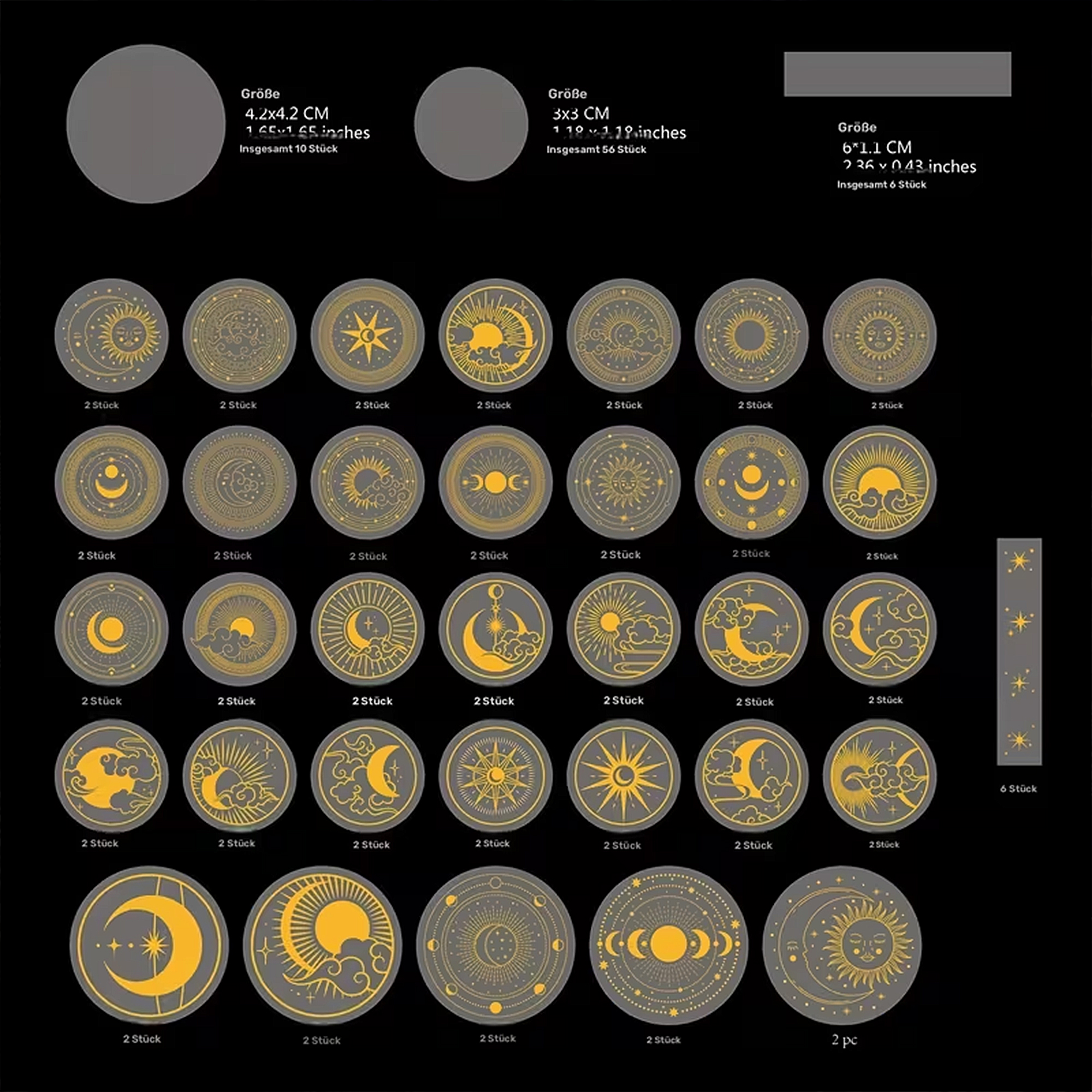 - Motive umfassen Mond, Sonne und Sterne in unterschiedlichen Ausführungen.