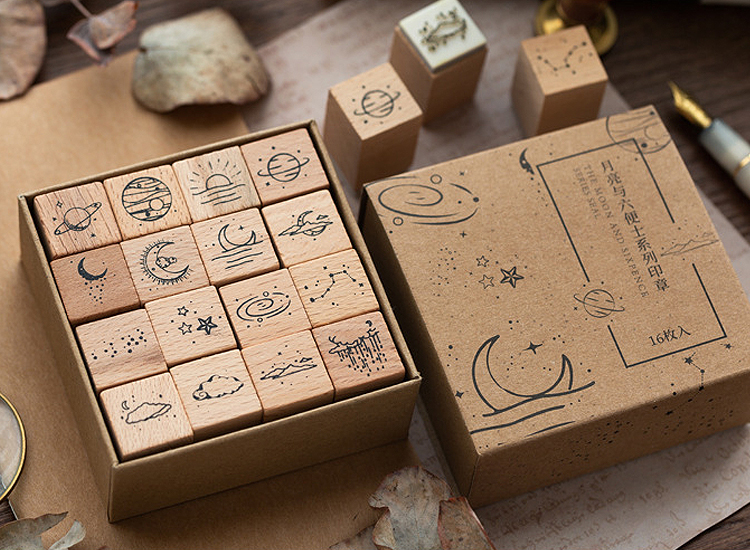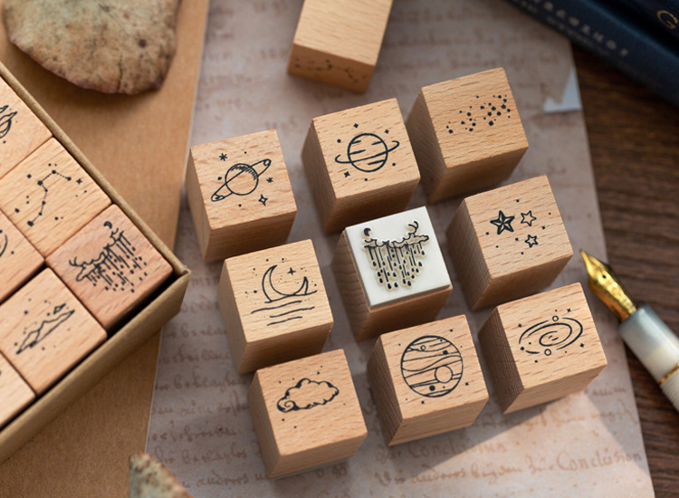 Weltall Holzstempel Set – 16-teilig mit Astronauten, Planeten und Sternen